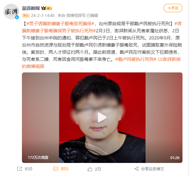 2024年2月3日据相关媒体报道,2020年9月台州市自然资源与规划局干部戴某为获取意外保险赔偿金,诱骗新婚妻子服下河豚毒素致死。2022年,戴卢民因犯故意杀人罪一审被判处死刑,二审维持原判。2024年2月2日上午戴某被执行死刑。